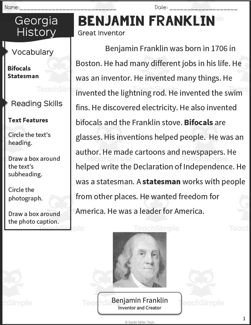 This worksheet includes fascinating facts about Benjamin Franklin, his inventions, his role in the American Revolution, and more. You’ll have the opportunity to answer questions, solve puzzles, and even color in a portrait of this historical figure.