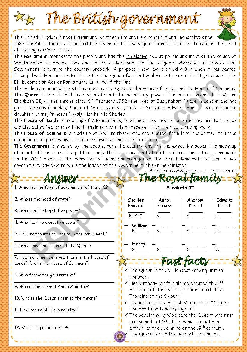 THE BRITISH GOVERNMENT ESL Worksheet By Silvia patti