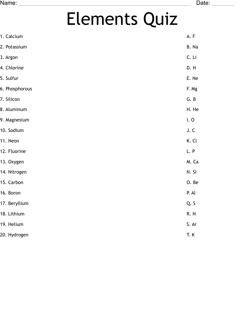 Elements Quiz Worksheet WordMint